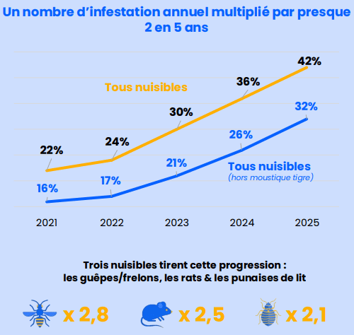L'infestation de nuisibles est devenue un risque majeur pour les foyers français, avec 62% de la population touchée au cours des cinq dernières années. Ce phénomène, dont la fréquence a doublé en cinq ans*, dépasse désormais la crainte du cambriolage ou du dégât des eaux dans l'esprit des particuliers.