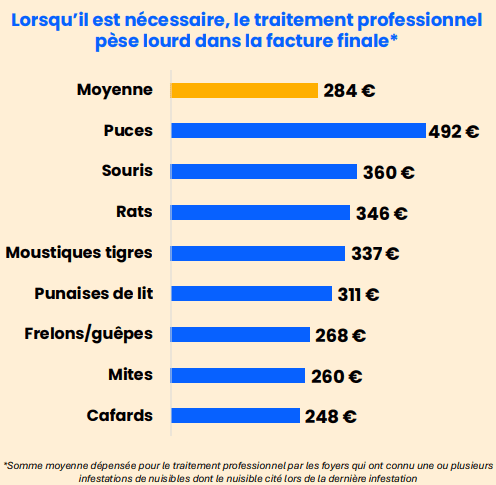 Le traitement professionnel des nuisibles représente un investissement financier lourd, pouvant contraindre les ménages à réduire leurs dépenses essentielles. Le coût moyen varie selon l'espèce, mais les sommets sont atteints pour les punaises de lit.