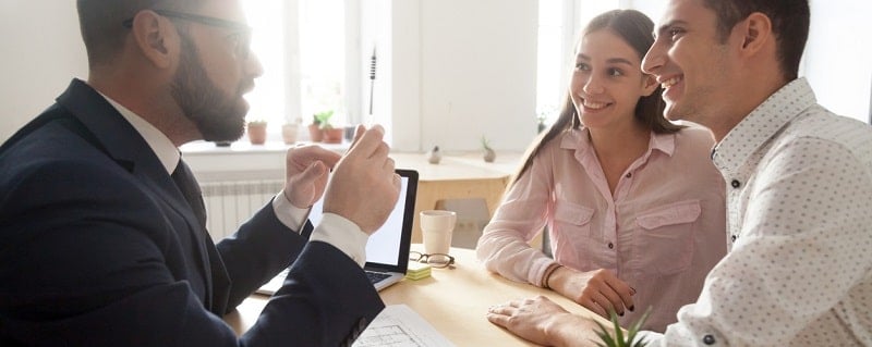 couple devant un professionnel de l'assurance habitation