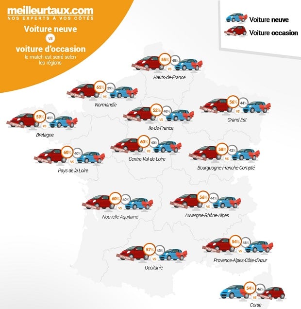 Toutefois, en Normandie, Pays de la Loire, Nouvelle-Aquitaine, Bretagne et Centre/Val de Loire, l’avantage est aux voitures d’occasion de manière plus marquée.