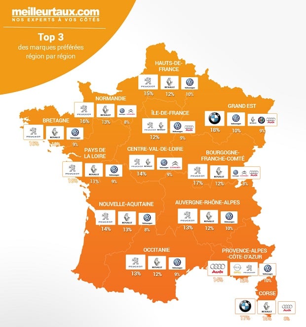 Peugeot est la grande favorite dans la plupart des régions où elle dépasse la marque au losange. Les allemandes arrivent dans le top 3 grâce à la marque Volkswagen qui se place en 3ème position dans la quasi-totalité des régions.