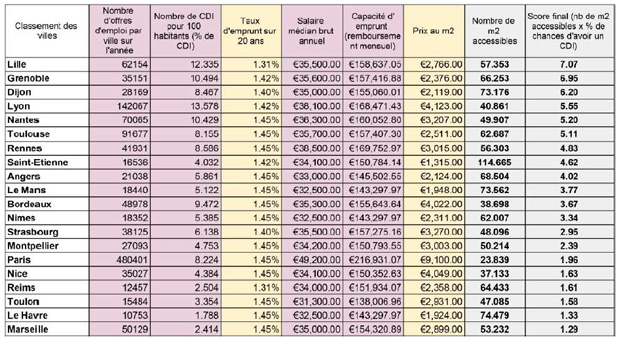 L’étude mesure ainsi le nombre d’offres d’emploi en CDI rapporté au nombre d’habitants et le pouvoir d’achat immobilier. Le pouvoir d’achat immobilier a été calculé à partir du salaire moyen dans chaque ville, des taux d’intérêt pratiqués localement et du prix de l’immobilier 1. En croisant ces données, Jobijoba et Meilleurtaux.com vous disent où vous avez le plus de chance de concilier l’accès à un emploi stable et à un logement.