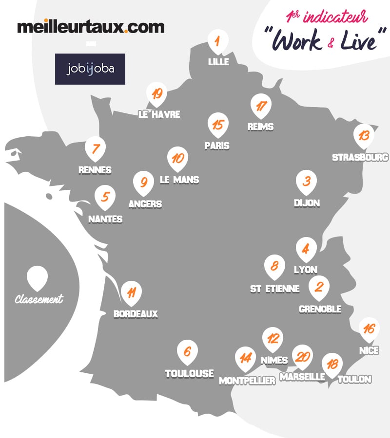 Partant du principe qu’un emploi stable et un salaire conditionnent généralement l’accès au logement, Jobijoba et Meilleurtaux.com ont élaboré une méthodologie qui prend en compte pour la première fois ces trois données – emploi, salaire, logement – afin d’établir un palmarès des 20 plus grandes villes françaises offrant le plusd’opportunités.