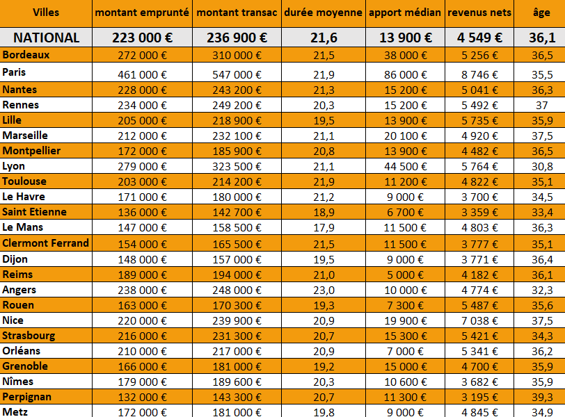 A titre d’anecdote, notons que dans 4 villes, à savoir Le Havre, Le mans, Clermont Ferrand et Perpignan, plus de la moitié des acheteurs ont emprunté avec aucun apport, c’est-à-dire sans le moindre euro déboursé.