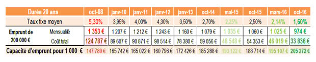 Si le titre peut sembler « provocant », certains emprunteurs potentiels ne réussissant pas à obtenir un crédit immobilier en raison notamment de la précarité de leur emploi, force est de constater que la baisse des taux a non seulement fait baisser le coût du crédit (-37 % en seulement un an), mais également permis d’augmenter la capacité d’emprunt de 8 % (toujours en un an).