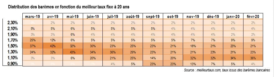 La grande majorité des barèmes sont toujours sous les 1,50% et près de 4 banques sur 10 affichent des taux sous les 1,30%. Cependant, ces derniers mois nous constatons la quasi-disparition des barèmes inférieurs à 1,10%.