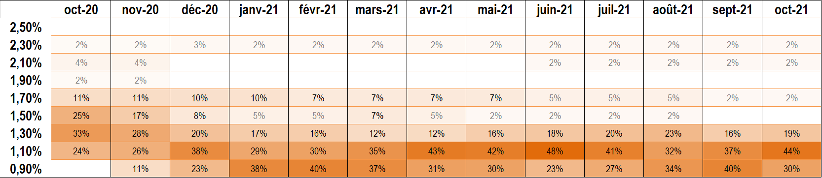 Sur la distribution des barèmes en fonction du meilleur taux fixe à 20 ans, Meilleurtaux.com observe que 7 barèmes sur 10 sont sous la barre de 1,30% et 30% des offres sont inférieures à 1,10%. Les taux longs (OAT) sont eux récemment repassés en positif mais sans aucune répercussion sur les barèmes pour le moment.