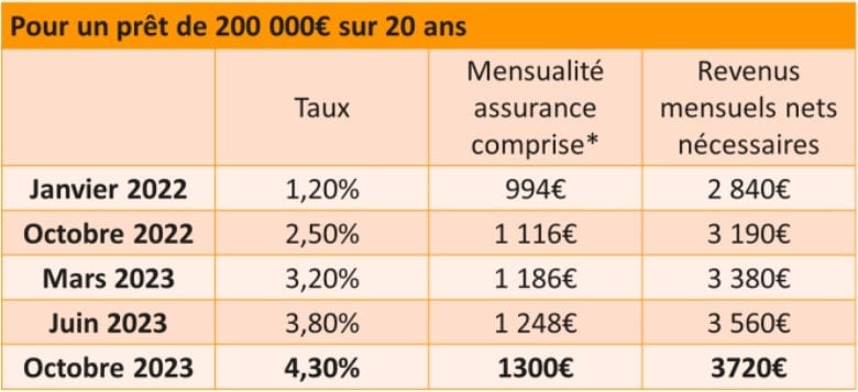L’impact de ces hausses est immédiat car pour un prêt de 200 000 euros sur 20 ans, il faut aujourd’hui gagner 30% de plus.