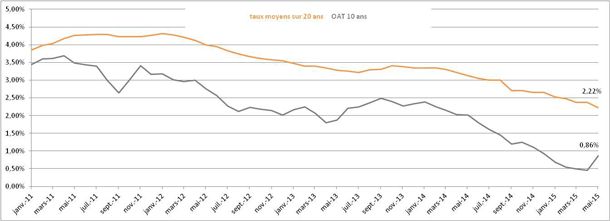 Les taux moyens des crédits aux particuliers enregistrent de nouvelles baisses modérées dans le courant du mois de mai. Les taux moyens affichent en effet de nouveaux records à 2% sur 15 ans, 2,23% sur 20 ans et restent stables sur 25 ans. « Les moyennes observées sont donc toujours en baisse, preuve que la tendance dominante en mai dans les établissements bancaires était bien baissière » remarque Maël Bernier, directrice de la communication de Meilleurtaux.com. « Concernant les taux réservés aux meilleurs dossiers, ils bénéficient également d'un mouvement baissier mais encore plus marqué que pour les moyennes avec des taux immobiliers désormais largement inférieurs à 2% y compris pour la durée 25 ans » selon Hervé Hatt, Président de Meilleurtaux.com.