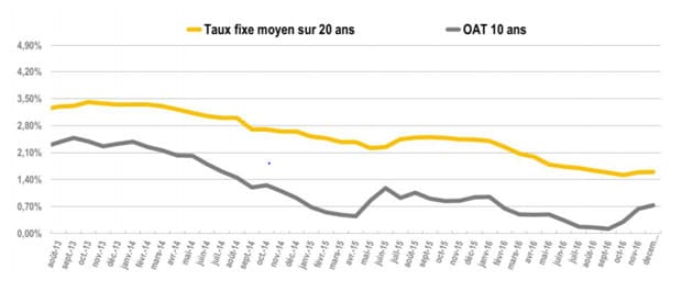 « Pour rappel, les taux moyens sur 20 ans sont passés sous les 2% en avril 2016 et nous ne prévoyons pas qu’ils dépassent cette barre psychologique dans le courant du 1er trimestre 2017 ».