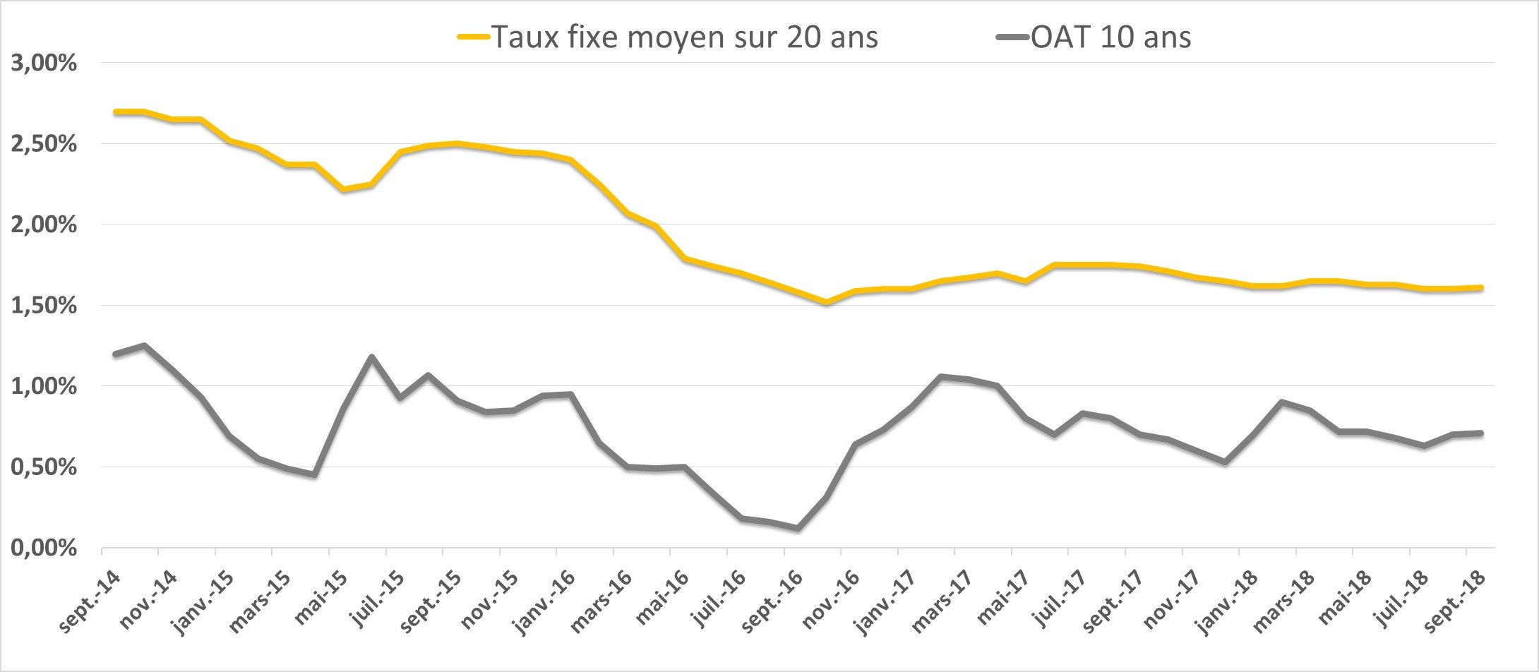 Les taux affichés frôlent les records de 2016. Pour rappel, en septembre 2016, le taux moyen sur 20 ans s’établissait à 1,58% contre 1,61% en septembre 2018. Mais dans les faits, les records sont atteints car la grande majorité des établissements décotent très facilement à 0,20% en dessous des taux affichés.