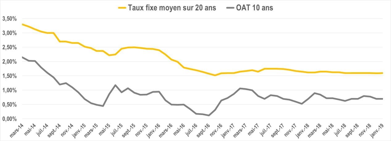 Concrètement, cela nous permet d’anticiper des taux de crédits immobiliers moyens toujours sous la barre des 2 % sur les durées allant jusqu’à 25 ans, au moins jusqu’au printemps 2019, les banques n’ayant comme c’était déjà le cas lors des dernières années, que le crédit immobilier comme outil pour capter des nouveaux clients.
