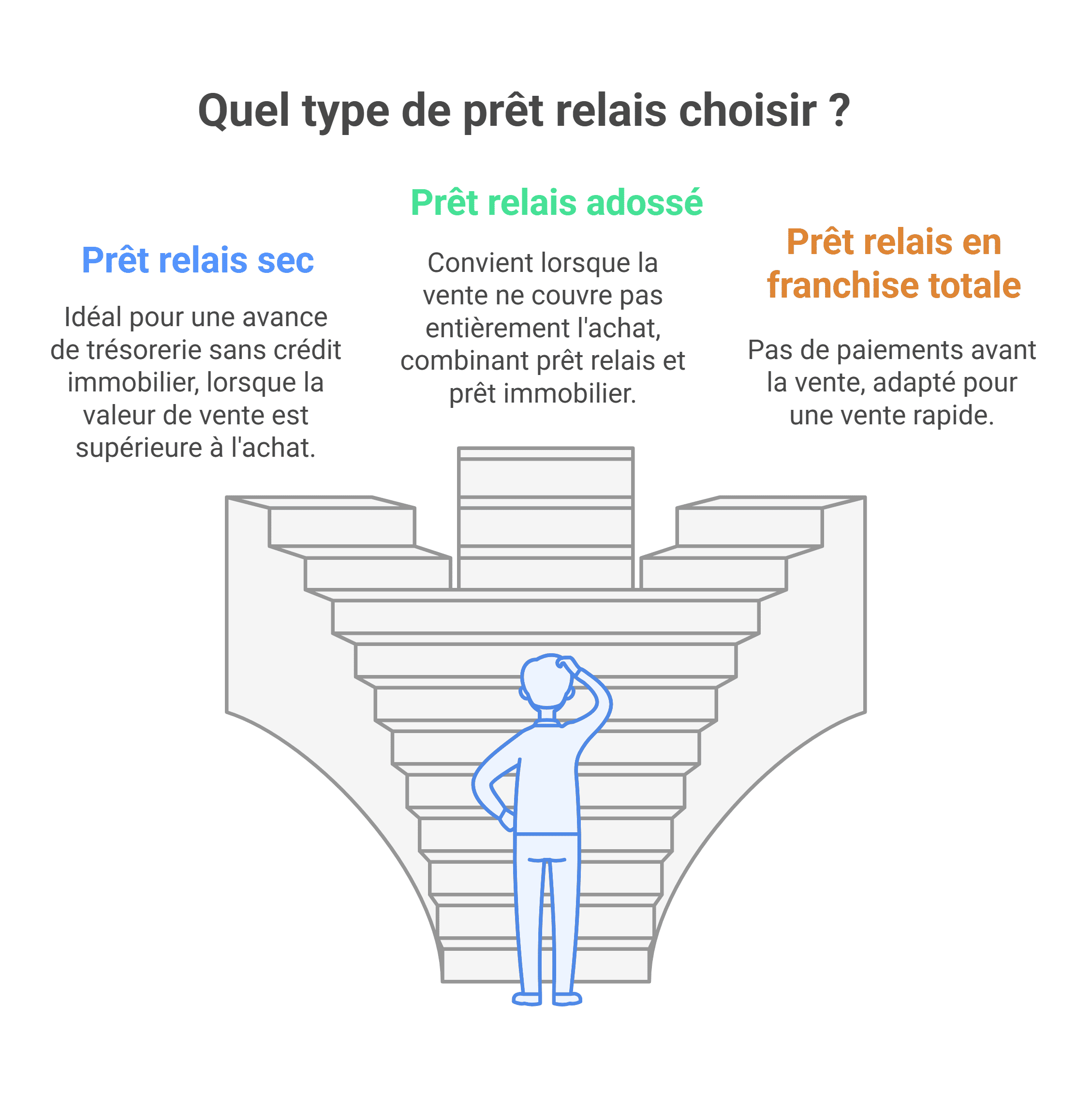 Il existe différents modes de financement sous la forme de prêts relais. Le choix de la meilleure formule dépend avant tout de votre situation financière personnelle et du montant du bien immobilier à acquérir.