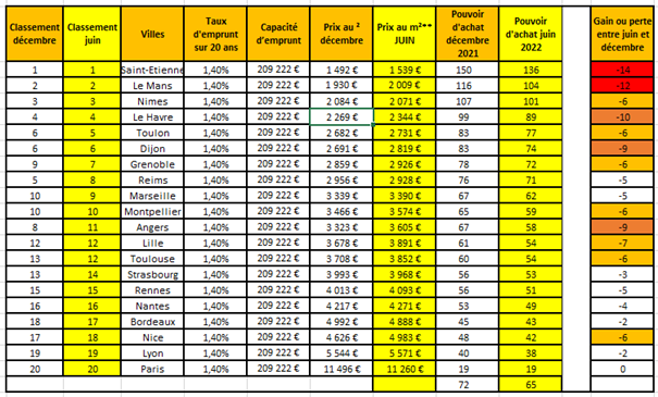 Paris, le 21 juin 2022 - Les taux n’ont cessé de chuter ces cinq dernières années pour atteindre des records en 2021. Pendant ce laps de temps, de nombreux Français ont atteint le graal : devenir propriétaires à coût quasi nul ! Mais cette époque est révolue et la remontée des taux s’affiche clairement. L’augmentation qui a débuté doucement en janvier s’est accélérée dès le mois de mars et ce n’est sans doute pas terminé. Entre décembre 2021 et juin 2022, seulement 6 mois ont suffi pour faire baisser le pouvoir d’achat immobilier dans les 20 plus grandes villes de France.