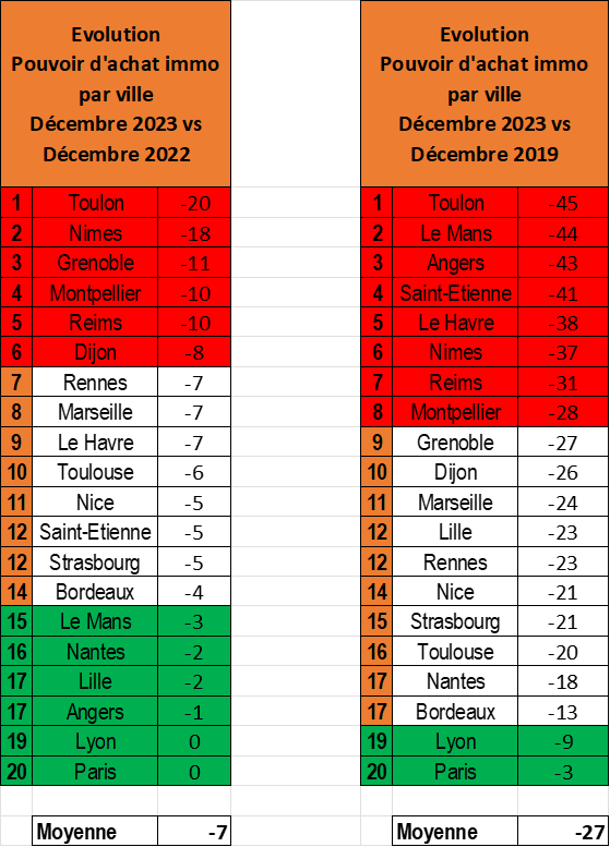 A contrario, depuis 2022, il n’y a aucun changement pour Paris et Lyon. Malgré la baisse de la capacité d’emprunt, les prix au m2 ayant baissé dans ces villes, nous n’observons aucune évolution sur le pouvoir d’achat immobilier.