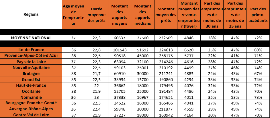 • En revanche, en Bourgogne-Franche-Comté, le montant moyen emprunté est le plus faible de France à 165 466€. Le montant de l’apport lui n’est pas le plus petit, il est à 34 522€. En région Grand-Est le montant de l’apport moyen descend à 33 954€ pour un prêt moyen à 190 860€.