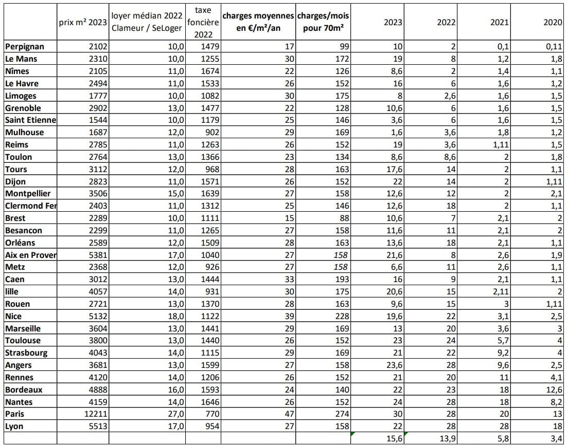 • Pour l’achat : du prix au m², de la taxe foncière, des charges moyennes par m2 par mois ;