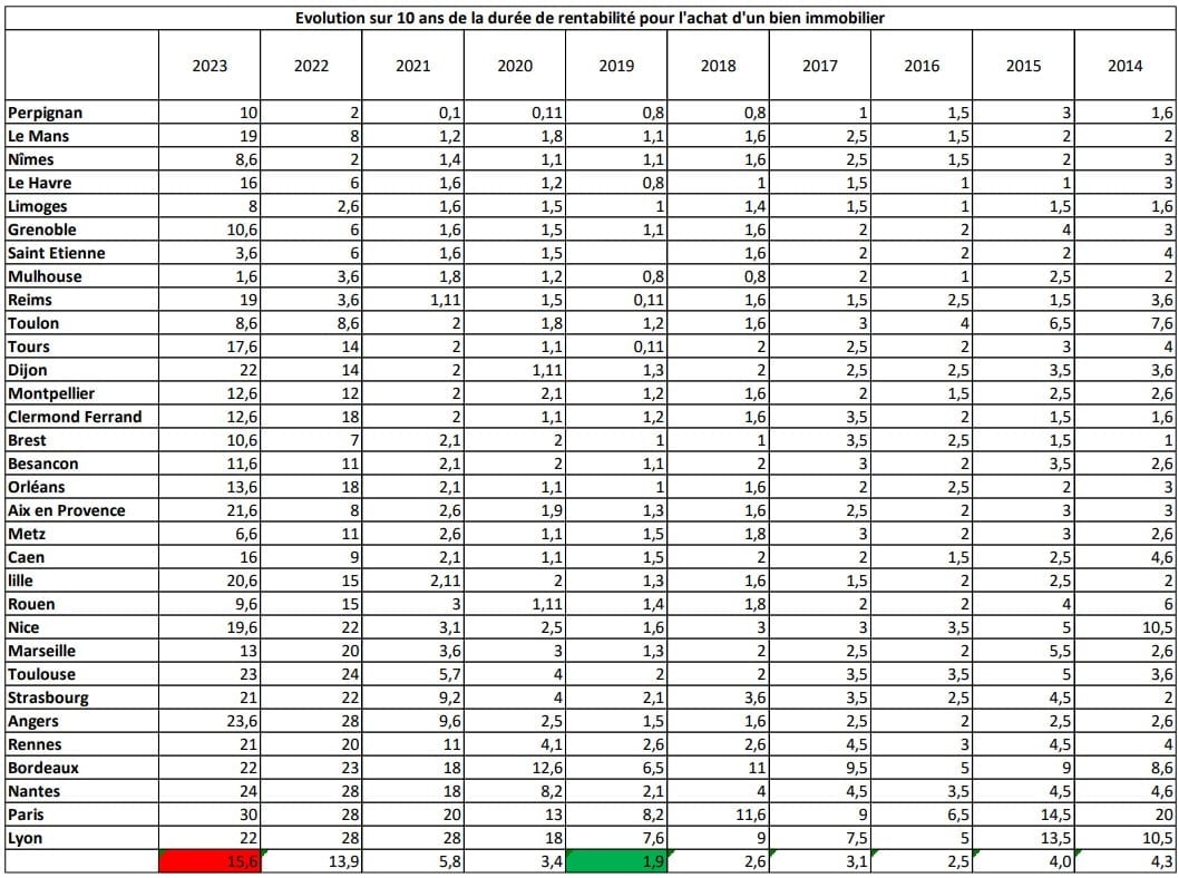 Enfin, des villes telles que Marseille, Lyon, Rouen, Metz et Orleans connaissent cette année une baisse significative de la durée moyenne de rentabilité d’un bien immobilier. Pour Marseille, par exemple, la durée passe de 20 ans en 2022 à 13 ans pour cette année et Metz de 11 ans à 6,6 ans.