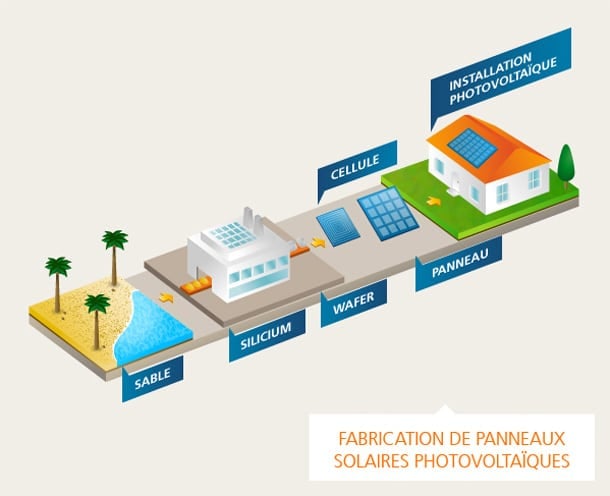 L'effet photovoltaïque est généré par le silicium, un matériau issu de la silice contenue dans le sable. Le silicium est utilisé sous forme de couches assemblées dans un cadre aluminium sous verre qui forme un panneau photovoltaïque. Ces couches reçoivent la lumière du soleil et la transforment en électricité.